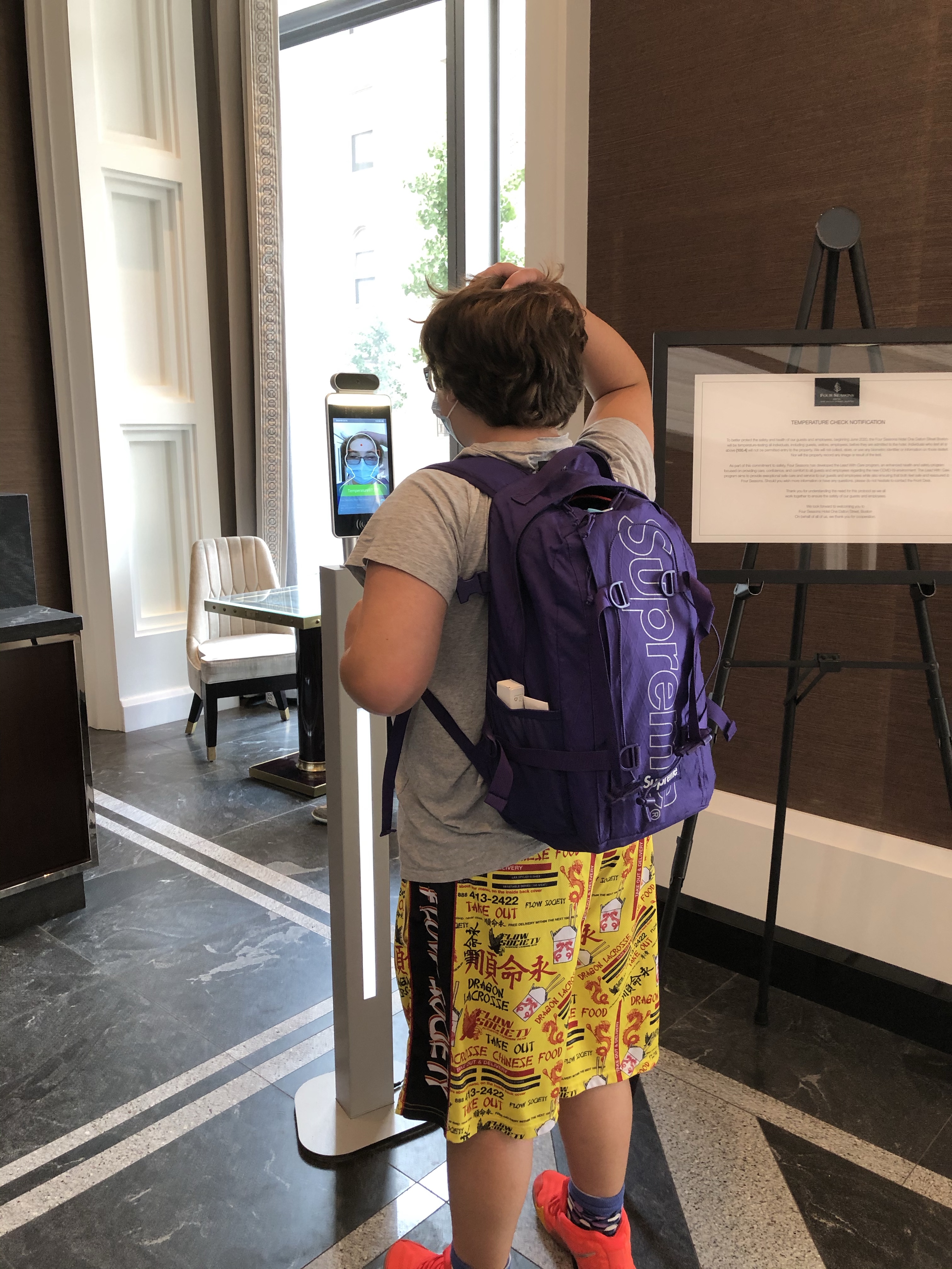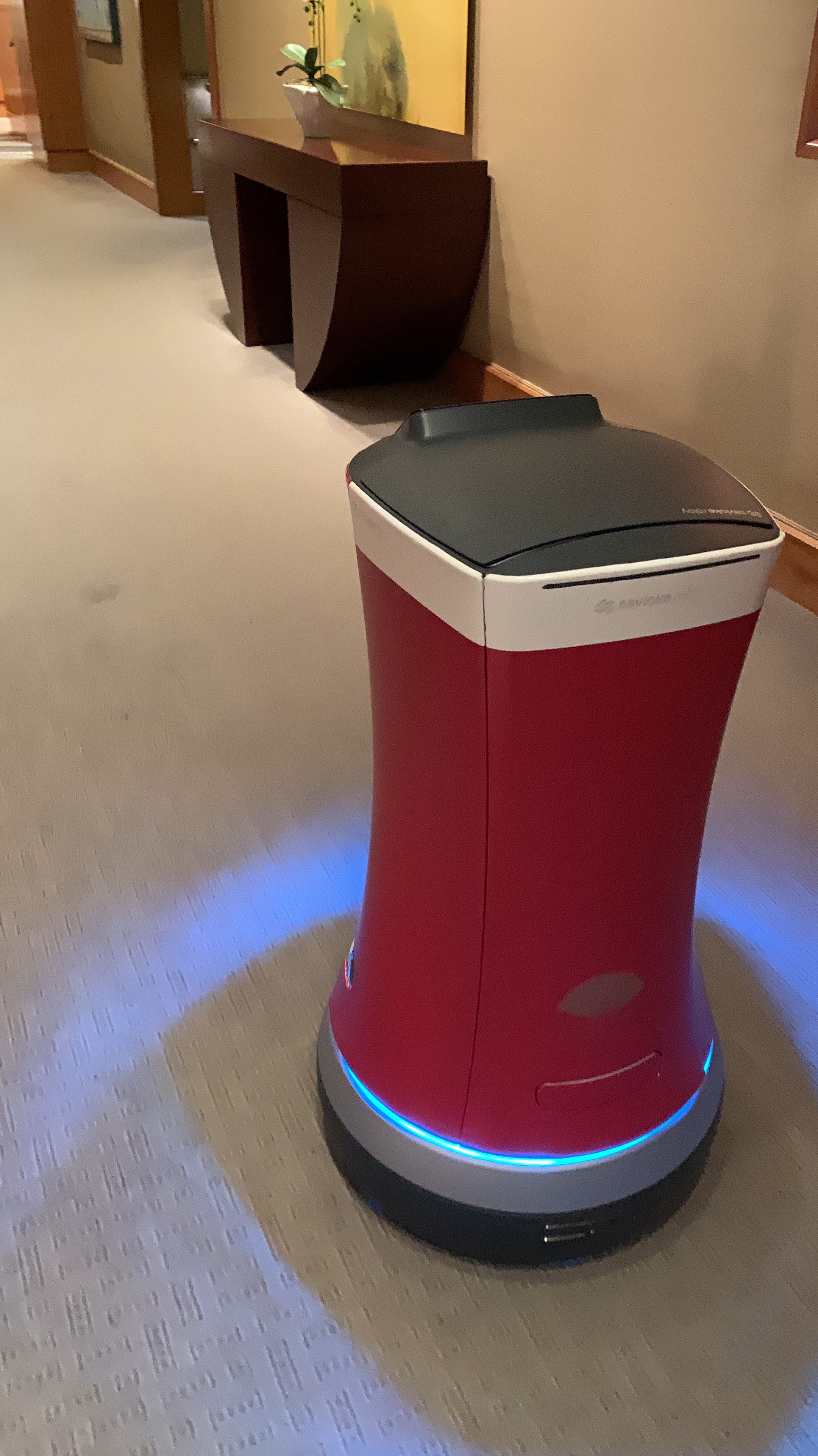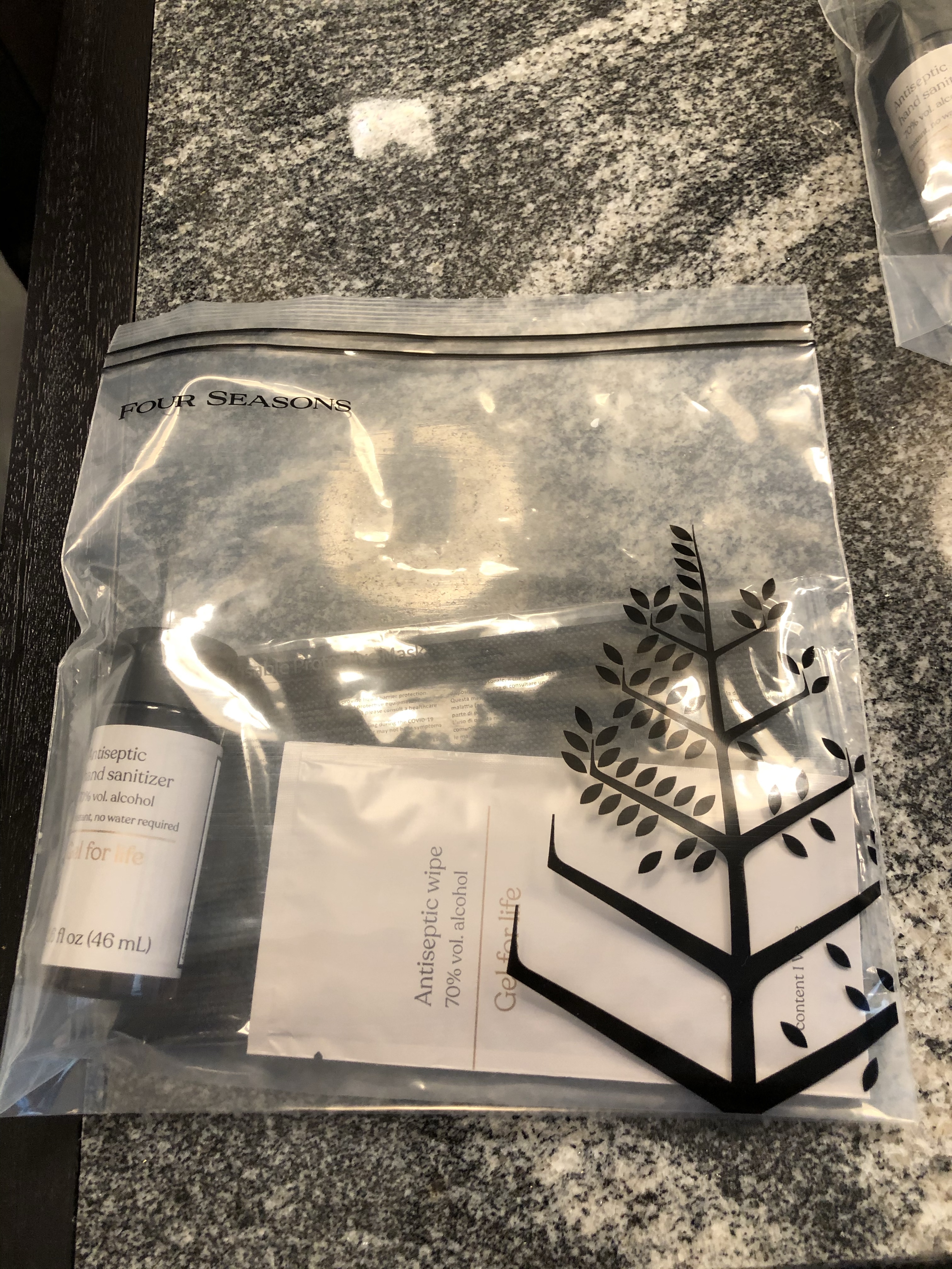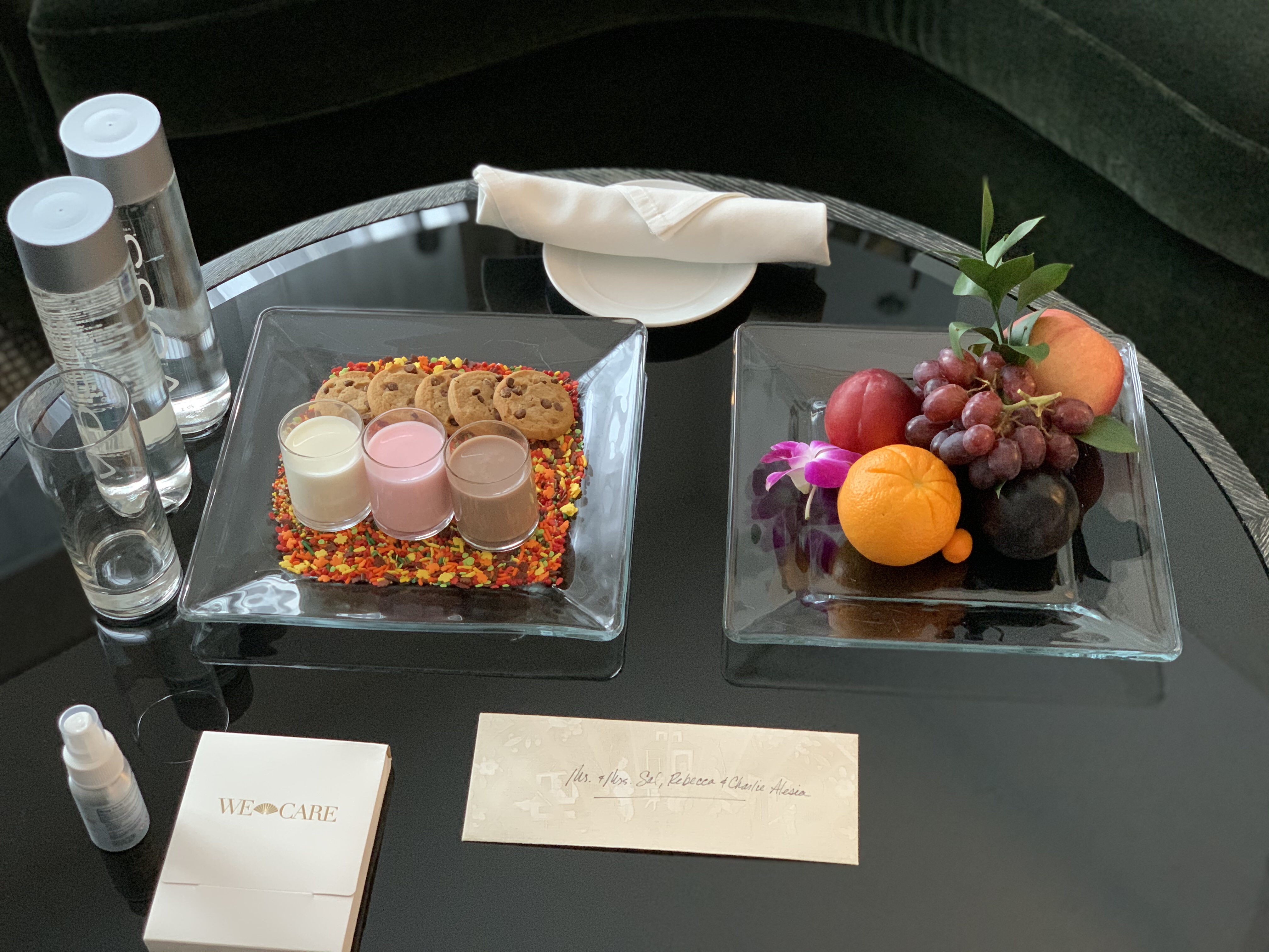 After our socially distanced check in, the front desk staff invited us to “follow Mobi” to our rooms – to our surprise and delight, Mobi, the Mandarin Oriental’s robot mascot – literally escorted us along our path to the elevator where he selected our floor for us, rode up with us in the elevator, and led us directly to our door! The room was lovely – freshly renovated, warm and inviting, with an array of sweet treats awaiting our late night snack cravings as well as complimentary “safety kits” with masks, sanitizer and gloves.