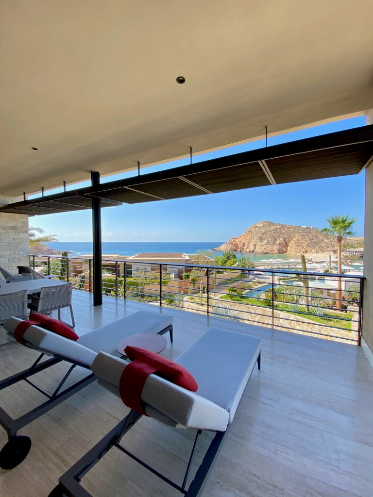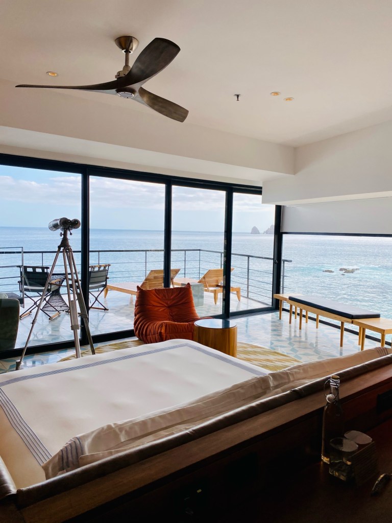 The Cape, A Thompson Hotel – a super cool, bohemian surfer’s paradise, this slick and fun resort is perched on craggy shoreline overlooking the famous arch of Cabo San Lucas. Rooms have ample balconies with spacious chaises, the views are incredible – and the rooftop bar is buzzy and features an amazing sunset view. Pro tip: traveling with friends? Make sure to check out their multi bedroom residences with private patios!