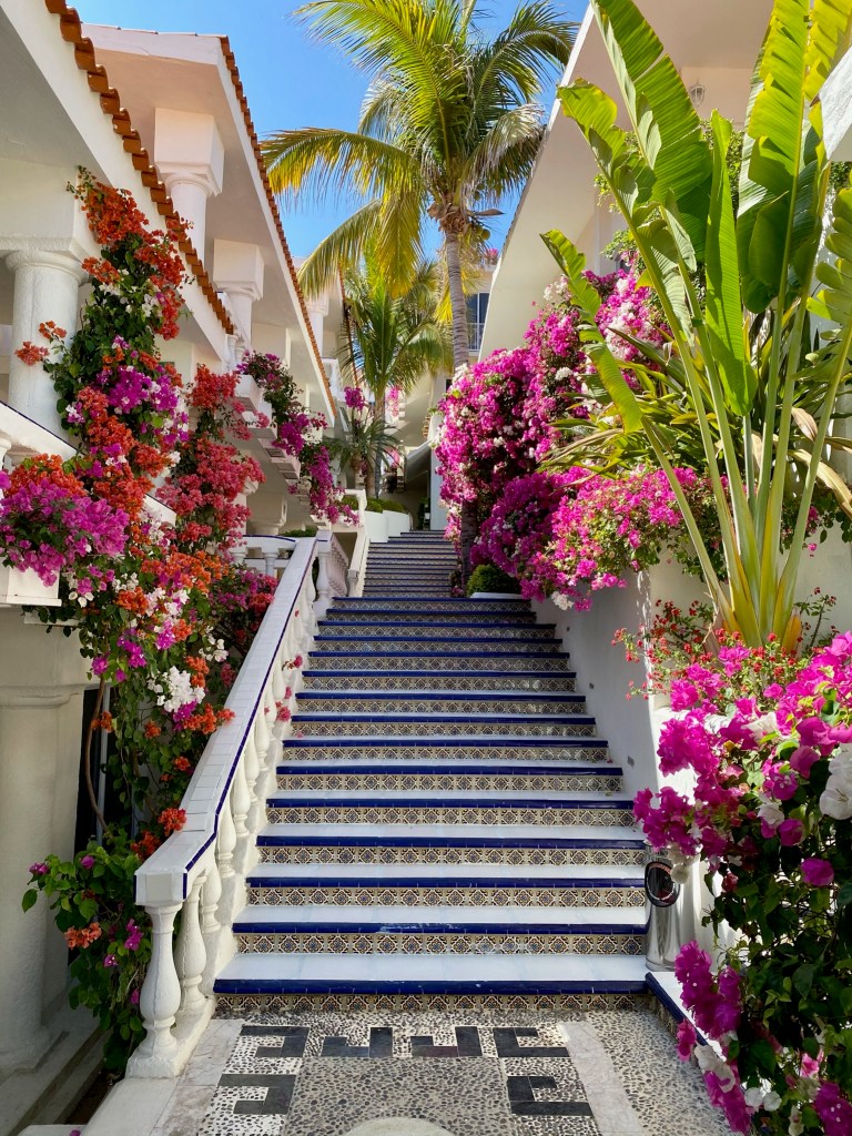 Velas Resorts: Mar del Cabo – this charming boutique property is simple and elegant, with a white expansive staircase that enhances the rich azure blues of the sea behind and the scarlet flowers adorning the hallways.